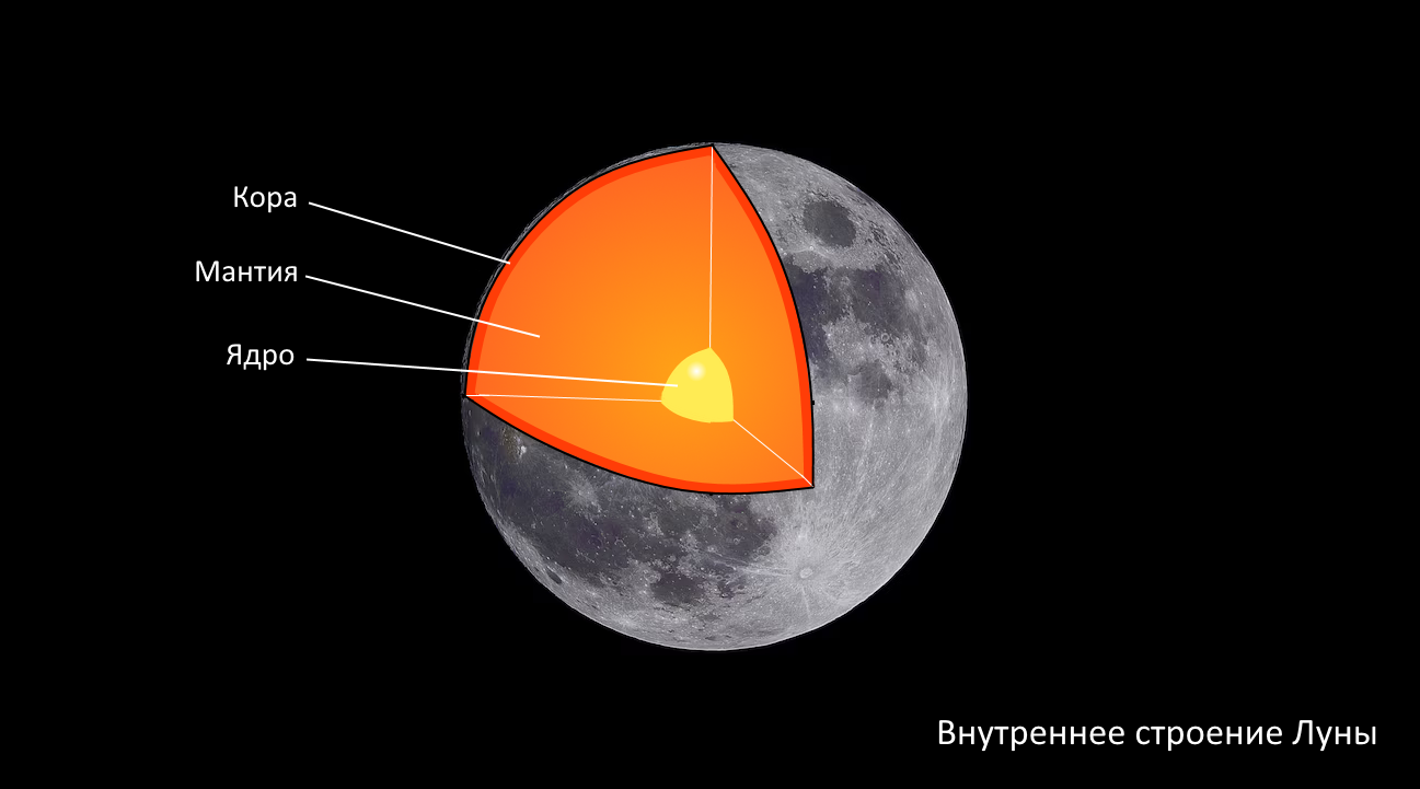 Строение ЛуныМощность поверхностного слоя Луны — реголита — колеблется в пределах 9-12 м.Под реголитом располагается слой толщиной от нескольких десятков до сотен метров, вещество которого состоит из выбросов, возникших при образовании больших кратеров. Далее до глубины 1 км идут слои из трещиноватого базальтового материала. Глубже находится мощная кора толщиной 60-100 км, мантия и возможно небольшое плотное ядро. ![]() ✕