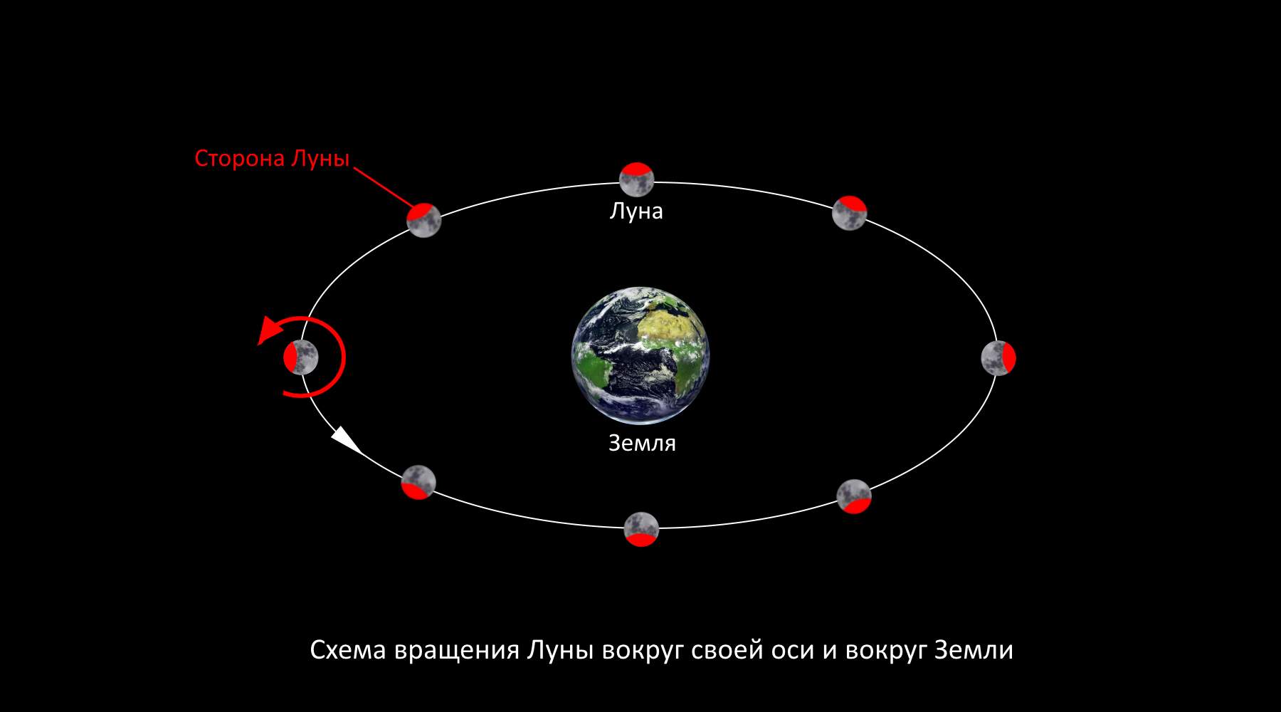 Характеристики: - радиуc — 1737 км (диаметр 3474 км); - масса — 7,34 * 1022 кг (1/81 массы Земли или 0,012 М⊕); - плотность — 3340 кг/м3; - среднее расстояние от Земли — 385 500 км (0,00257 а.е.); - период вращения вокруг оси — 27,3 суток; - период обращения вокруг Земли — 27,3 суток (27сут 7ч 43мин ); - эксцентриситет орбиты — 0,055; - наклон орбиты — 5,15°. Вращение и фазы ЛуныЛуна всегда обращена к Земле одной и той же стороной. Это происходит потому, что она вращается вокруг своей оси с той же скоростью , с какой обращается вокруг нашей планеты.![]() ✕