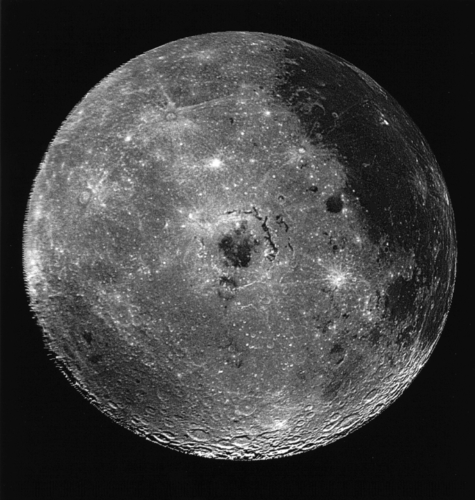 ![]() Восточный бассейн и западное полушарие Луны. Восточный бассейн расположен посередине фото и имеет диаметр около 1000 км. Темная область вверху справа - Океан Бурь. Фото АМС Галилео сделанное в 1990 г. с расстояния 560 000 км.