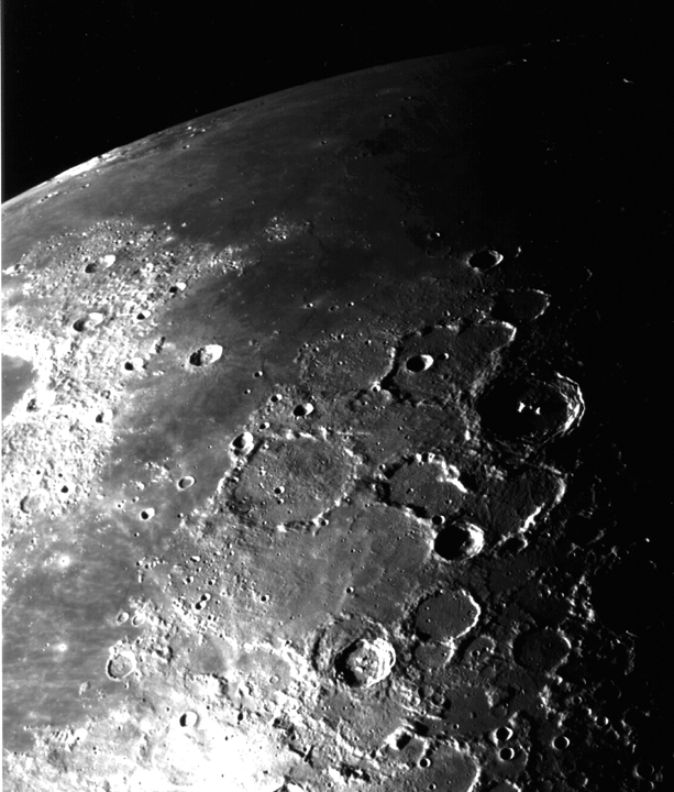 ![]() Скопление лунных кратеров в северо-восточной части Луны. Слева выглядывает кратер Келдыш. Ниже и справа от Келдыша находится небольшой кратер Геркулес F. Самый большой кратер на снимке - кратер Атлас. Снимок аппарата SMART-1 был сделан 3 февраля 2006 г, на высоте 2474 км над поверхностью.