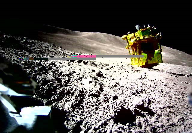 ![]() Изображение поверхности Луны и аппарата SLIM с маленького вездехода LEV-2 (Sora-Q).