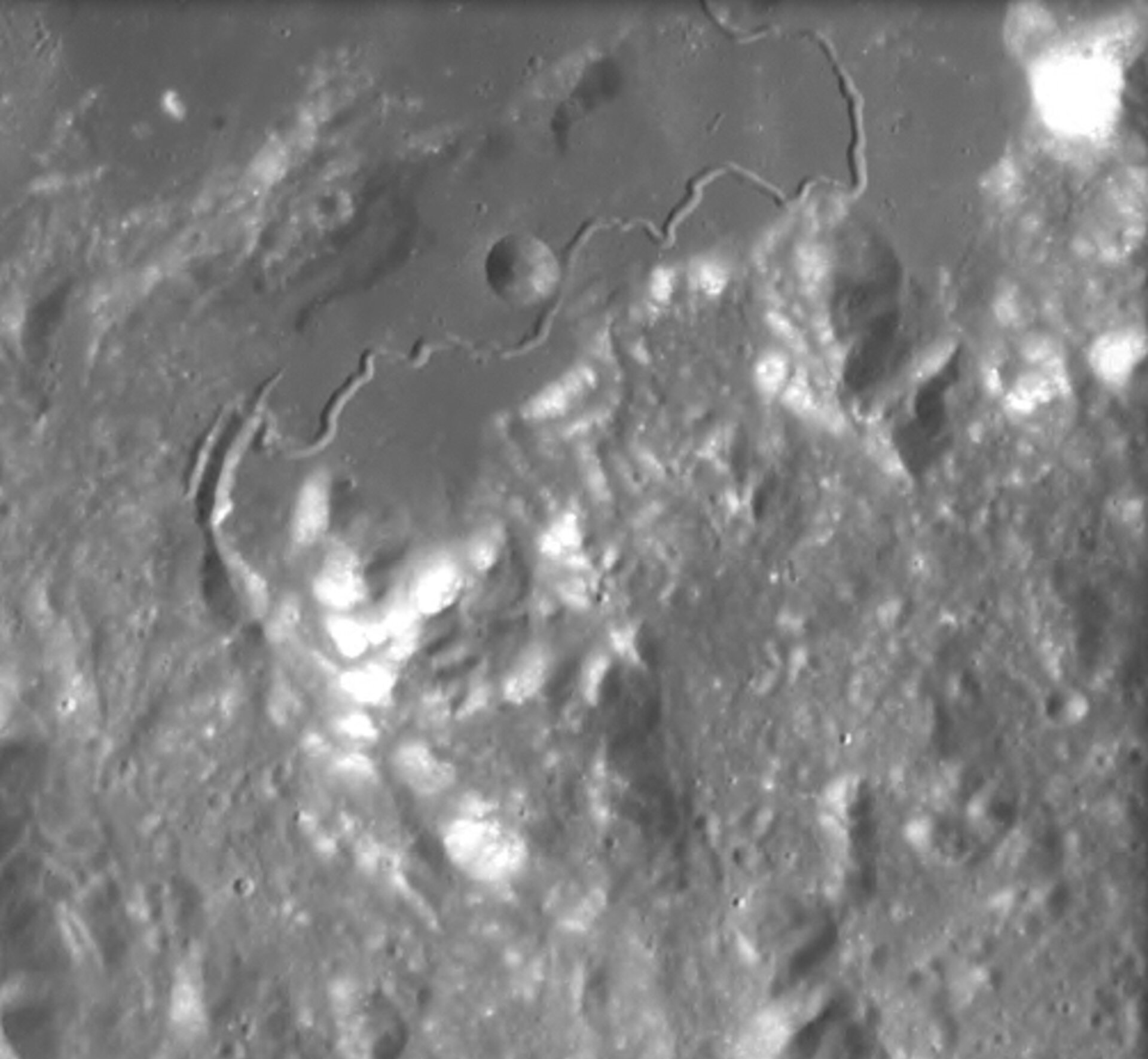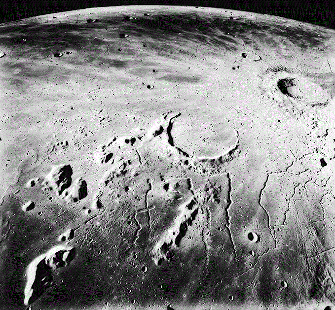 ![]() Извилистые линии к востоку от плато Аристарх. Кратер Аристарх диаметром 40 км находится вверху справа на изображении. Снимок метрической камеры Аполлона-15.