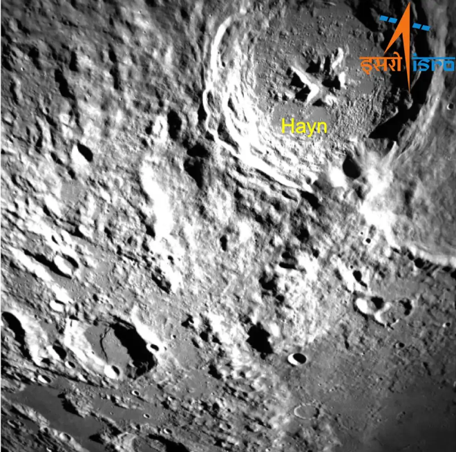 ![]() Область обратной стороны Луны с кратером Хайн. Снимок сделан с камеры обнаружения и предотвращения опасностей посадочного модуля (LHDAC) Чандраян-3 19 августа 2023 г.
