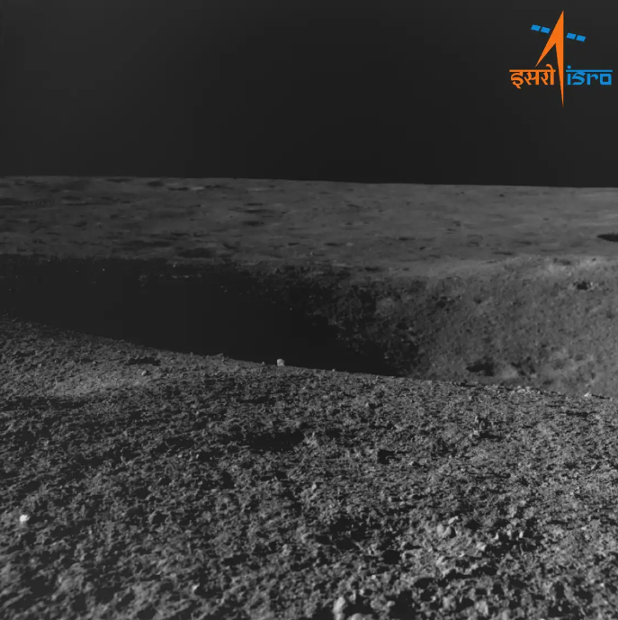 ![]() Кратер с которым столкнулся ровер Чандраяна-3 27 августа 2023 г. Вид с навигационной камеры.