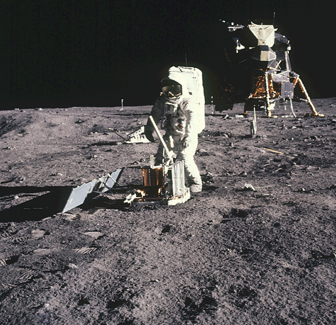 ![]() Аполлон-11. Астронавт Эдвин Олдрин развертывает сейсмометр питаемый от солнечной панели слева.