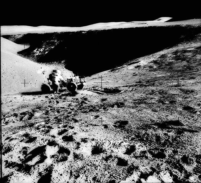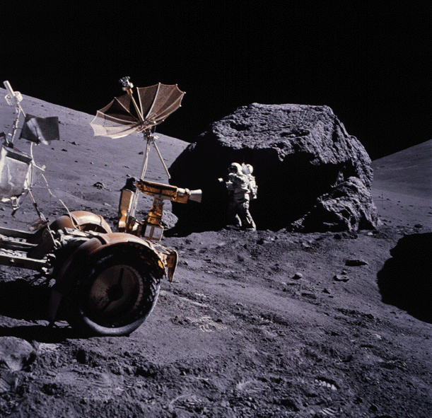 ![]() Аполлон-17. На фотографии изображены астронавт Харрисон Шмитт, лунный ровер и большой валун на Луне. Фотографию сделал астронавт Юджин Сернан. Дата: 13 декабря 1972 г.