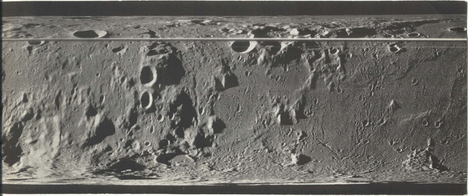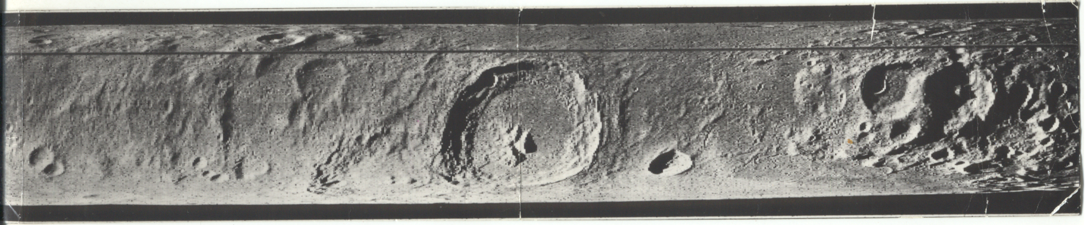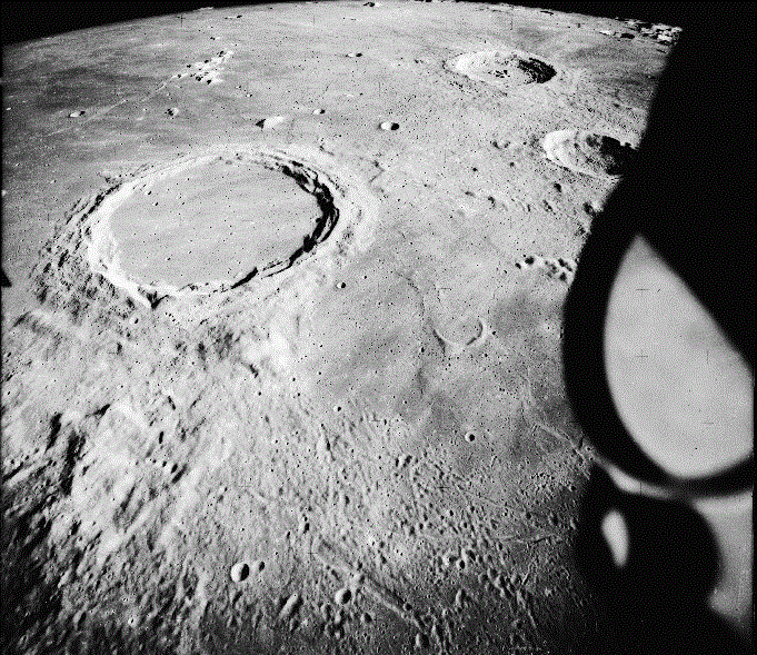 ![]() Косой вид на кратер Циолковский на Луне. Его диаметр составляет около 185 км. Снимок метрической камеры Аполлона-15.