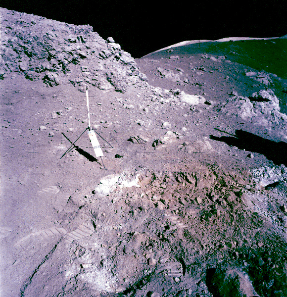 ![]() Аполлон-17. Цветное изображение оранжевого грунта кратера Шорти на Луне. Штатив слева в центре представляет собой гномон и фотографическую справочную таблицу. При внимательном обследовании грунта на Земле было обнаружено, что грунт содержит множество оранжевых частиц вулканического стекла, придающих характерный цвет. Снимок получен 12 декабря 1972 г.