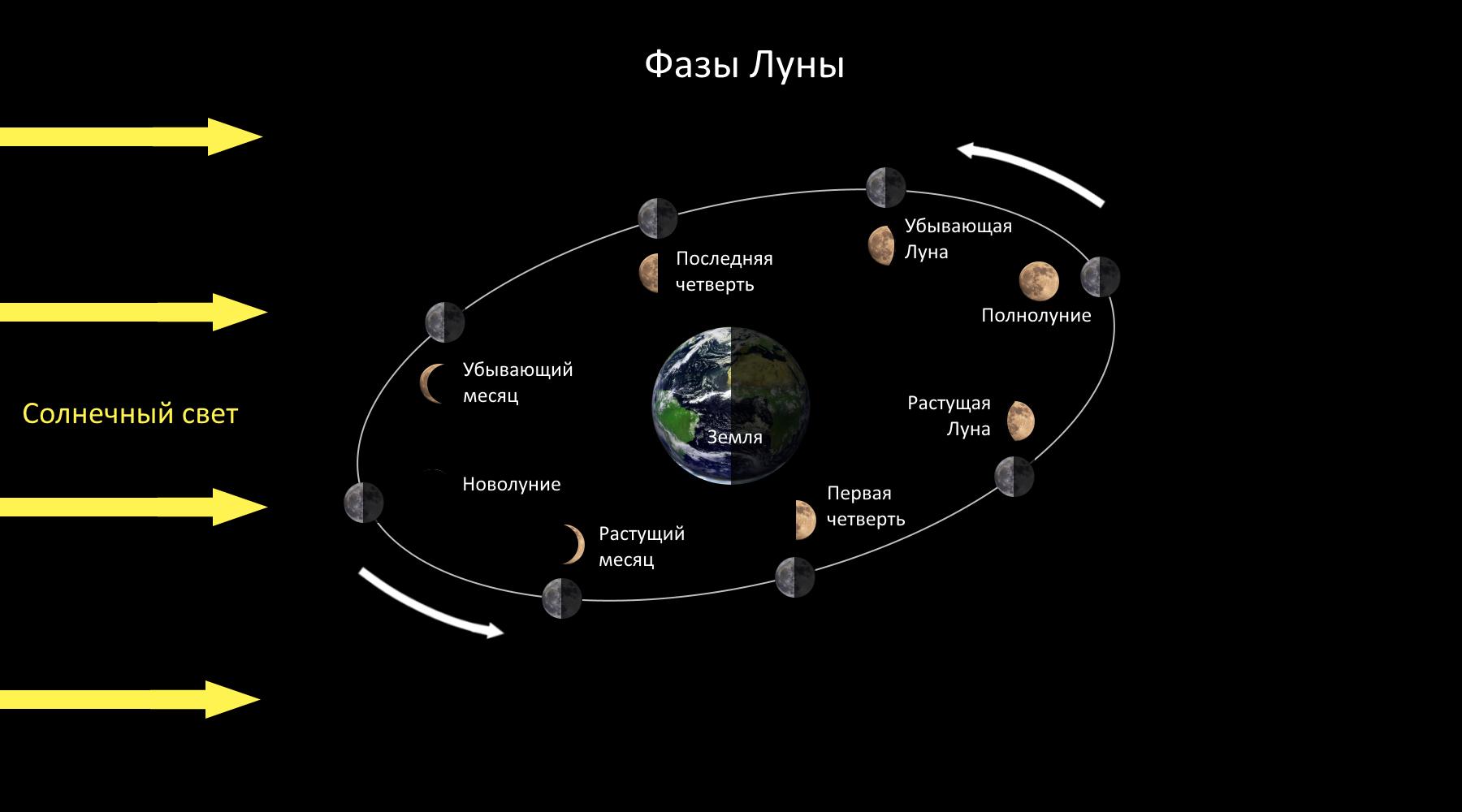 В зависимости от того, какая часть Луны освещена солнечными лучами, в течение месяца меняется форма Луны, видимая с Земли. Видимые формы Луны называют фазами. Основные фазы Луны: новолуние, первая четверть, последняя четверть и полнолуние. Промежуточные фазы: растущий месяц (растущий серп или молодая Луна еще называют), растущая Луна, убывающая Луна, убывающий месяц (убывающий серп или старая Луна еще называют). Всего 8 фаз Луны: Новолуние — Растущий месяц — Первая четверть — Растущая Луна — Полнолуние — Убывающая Луна — Последняя четверть — Убывающий месяц. ![]() ✕